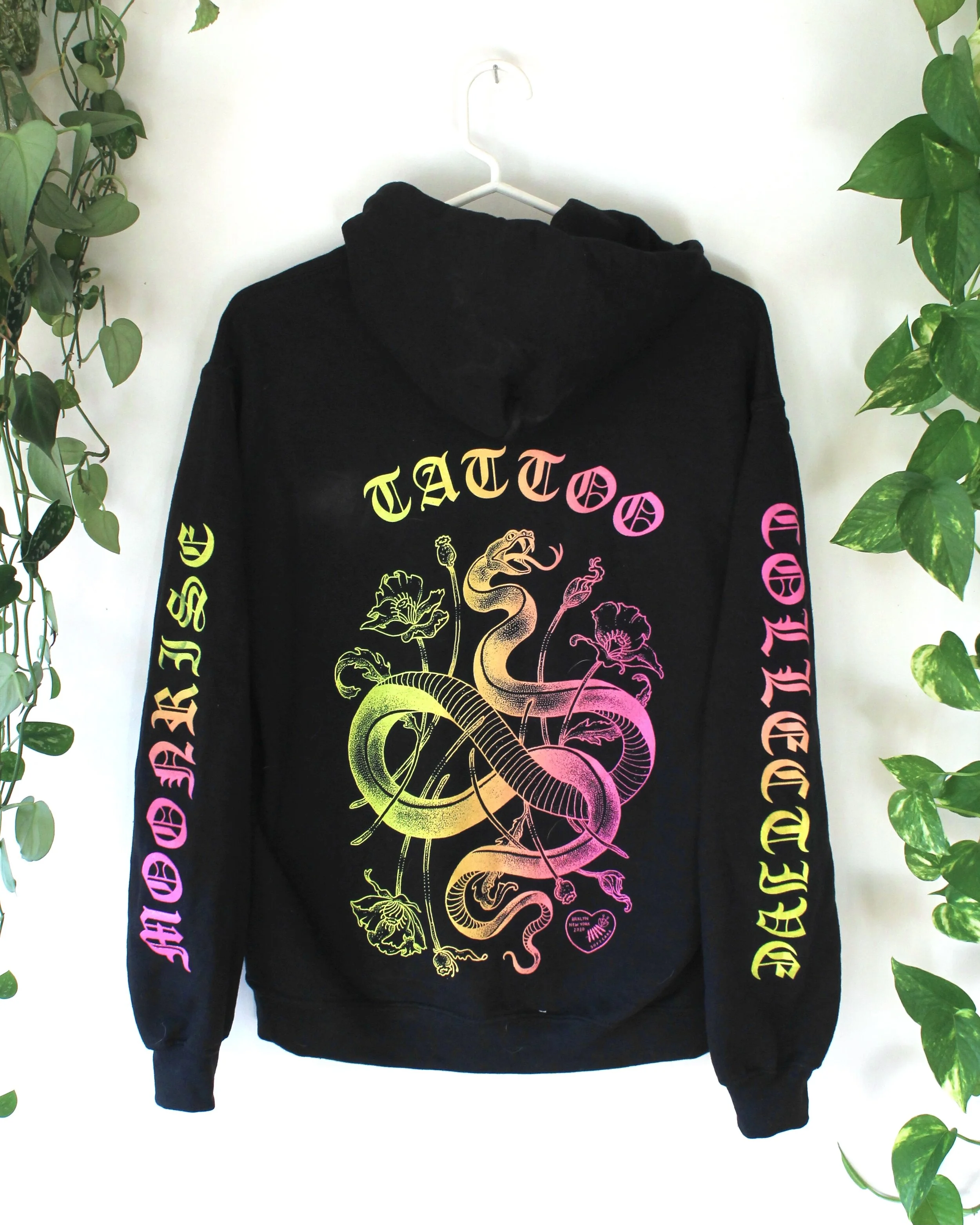 Gildan Heavyweight pullover hoodie in either Neon Green with black ink or black with neon gradient ink. A 16” illustration of a snake curling among poppy flowers in various states of bloom or bud spans the back of this shirt. The text “MOONRISE TATTOO COLLECTIVE” runs in blackletter along the length of each sleeve and above the snake. The front pocket/left chest is adorned by a 3” snake logo with the words “MOONRISE TATTOO COLLECTIVE” inscribed along it’s body.